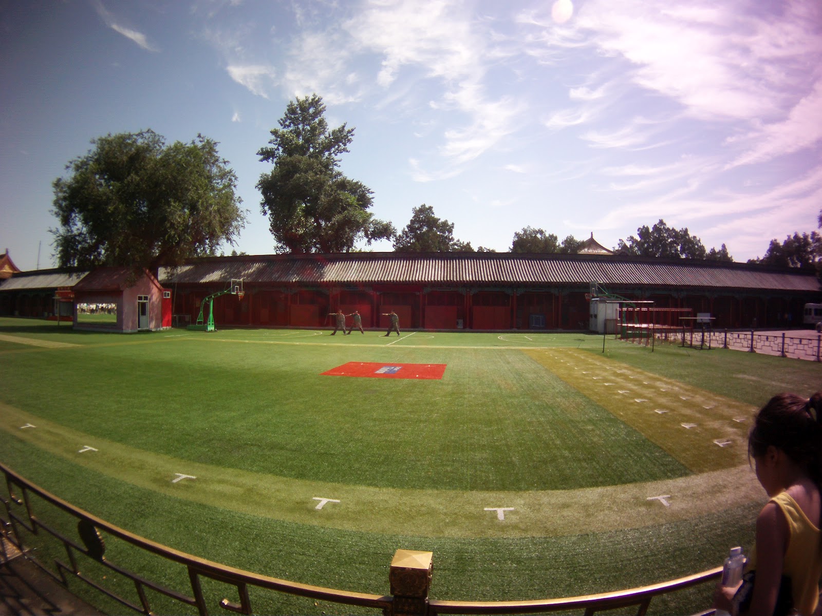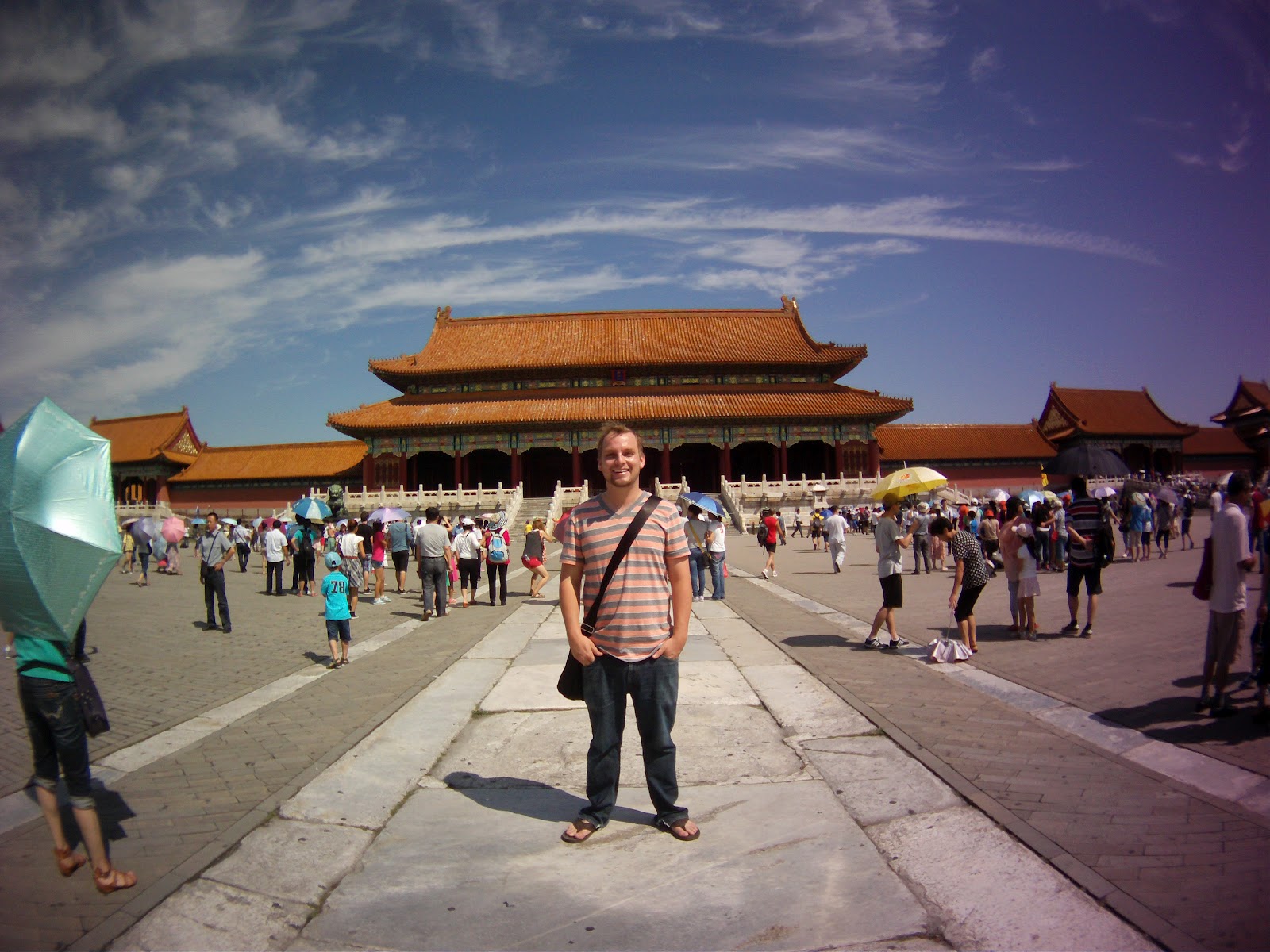 Yes... That is a basketball court.... made of astroturf.... in the Forbidden City. China is strange sometimes. Walking through the Forbidden City was very cool. My friend is very educated on the history and customs of ancient China so was about to give me a lot of cool details such as this one... The lighter grey area upon which I am standing in the following picture was raised a little bit above the rest of the ground. Only the emperor could walk on this raised portion, it was forbidden for anyone else too.